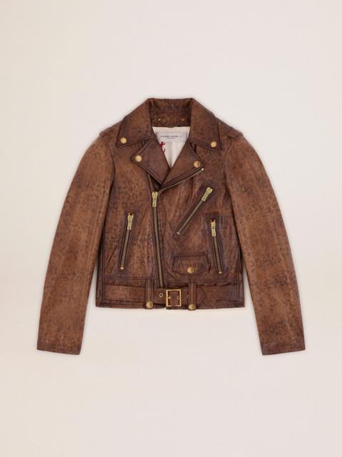 A unique, timeless collection that encapsulates the Golden Goose DNA, designed to remain with you every day, through thick and thin, come rain or shine. Made of our traditional bull leather, this slim-fit biker jacket features a distressed treatment and animal print. The burgundy paisley-print lining adds the finishing touch. DETAILS Item No. GWP00848.P000483.81325 - Color: animal print - Double gold star on the back - Slim fit - Four front pockets - Belt with buckle - Long sleeves - Zip fastening - Distressed finish - Main material: 100% cow leather - Lining: 100% viscose - Sleeve lining: 100% viscose - Made in Italy The model is 177 cm tall and is wearing a size S.