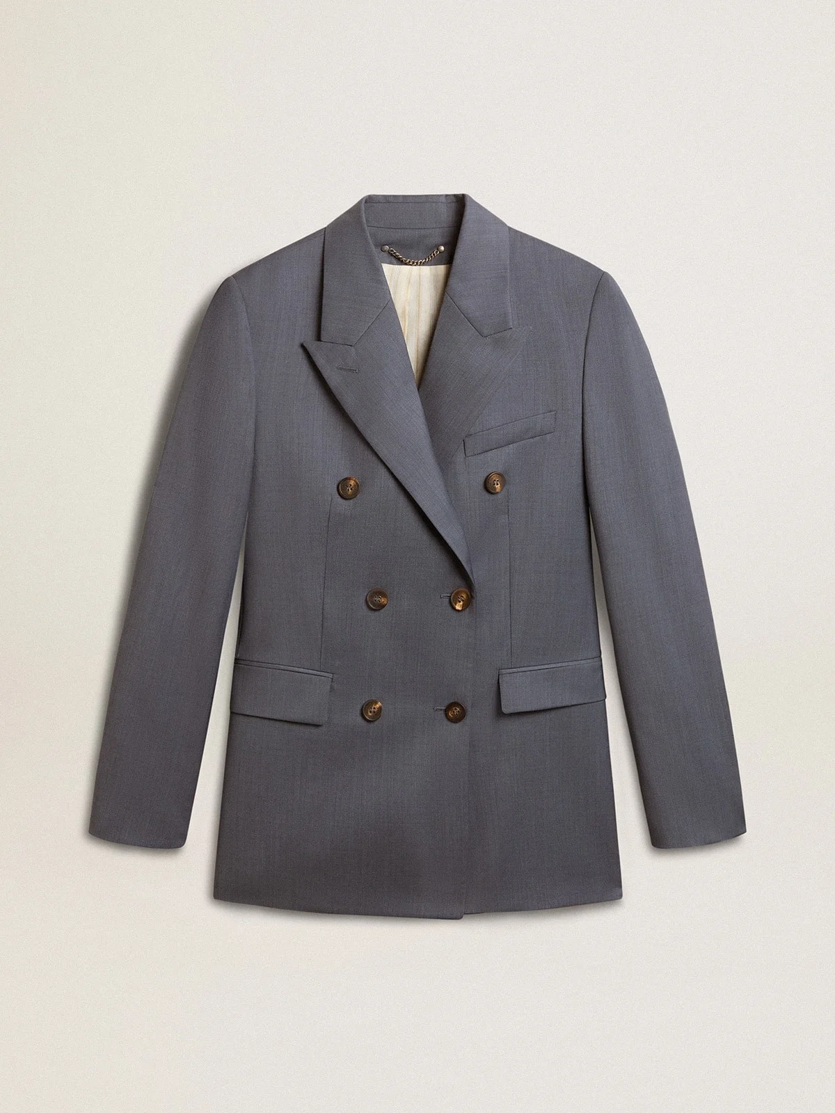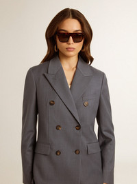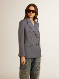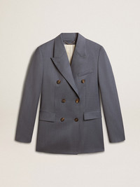 A love story to our home, Marghera. Where everything began. Our latest collection reflects the spirit of our birthplace, its contrasts, industrial soul, and manufacturing landscapes, weaving together inspirations from both the vibrant energy of workwear and the refined essence of traditional tailoring. This women's double-breasted wool blazer in baby blue features a fastening with logoed horn buttons. The choice of material is no accident, as this lightweight wool is ideal to be worn with the arrival of the summer. DETAILS Item No. GWP00829.P001609.50864 - Journey Collection - Color: baby blue - Double-breasted - Double star on the back - Three front pockets - Long sleeves - Regular fit - Fastening with horn buttons - Main material: 100% virgin wool - Lining: 49% cotton, 46% viscose, 5% polyester - Undercollar: 70% wool, 30% viscose - Made in Italy The model is 177 cm tall and is wearing a size 40.