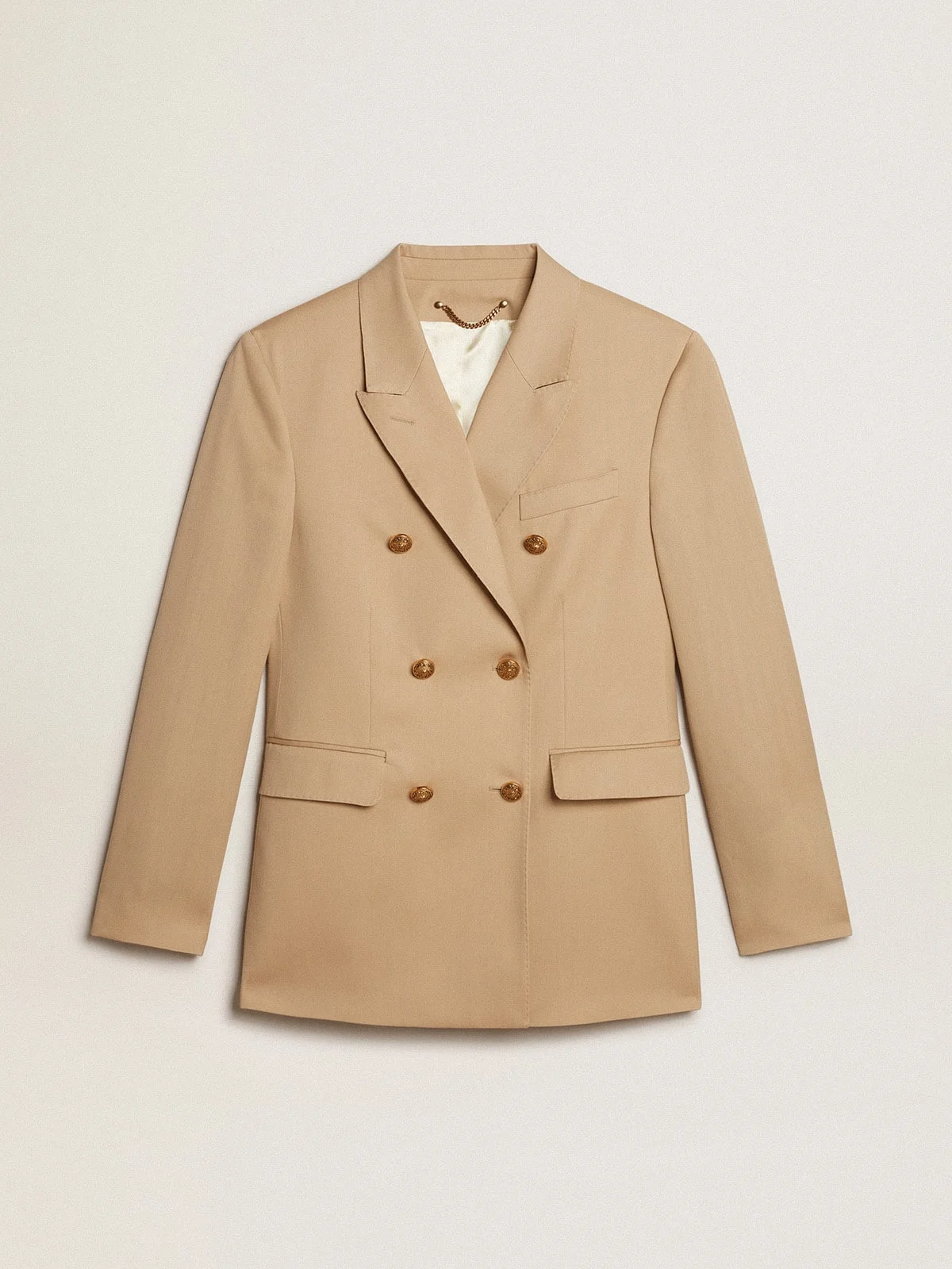 A unique, timeless collection that encapsulates the Golden Goose DNA, designed to remain with you every day, through thick and thin, come rain or shine. This women’s regular-fit double-breasted blazer in sand features a fastening with gold-colored heraldic buttons and a detachable white patch with a finely embroidered letter G in red. DETAILS Item No. GWP00829.P001267.15272 - Golden Collection - Color: sand - Double-breasted model - Double gold star on the back - Detachable white patch with embroidered red letter G - Three front pockets - Inner pocket - Inner lining with printed lettering - Long sleeves - Gold-colored heraldic button fastening - Main material: 100% virgin wool - Lining: 64% viscose, 36% rayon - Sleeve lining: 52% viscose, 48% acetate - Made in Italy The model is 177 cm tall and is wearing a size 40.