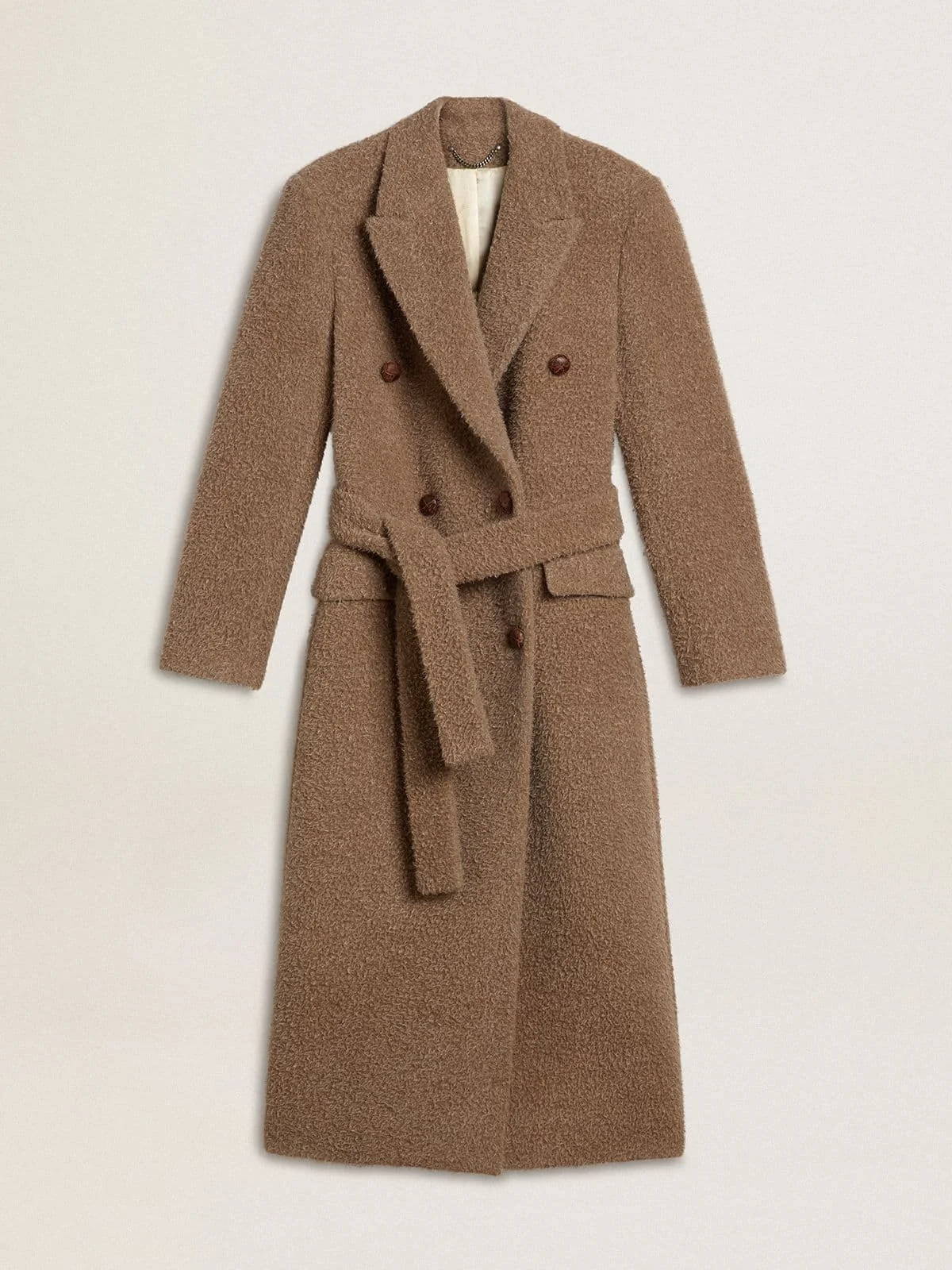 The second drop in the Fall/Winter 25 collection unfolds like a relaxed and refreshing journey, woven into the fabric of each and every piece. This double-breasted coat in a beige wool blend features a brown button fastening, two front pockets and a belt at the waist. DETAILS Item No. GWP02319.P002091.60407 - Journey Collection - Color: beige - Double star on the back - Belt at the waist - Double-breasted - Two pockets - Main material: 50% virgin wool, 33% mohair, 17% polyamide - Made in Italy The model is 177 cm tall and is wearing a size 40.