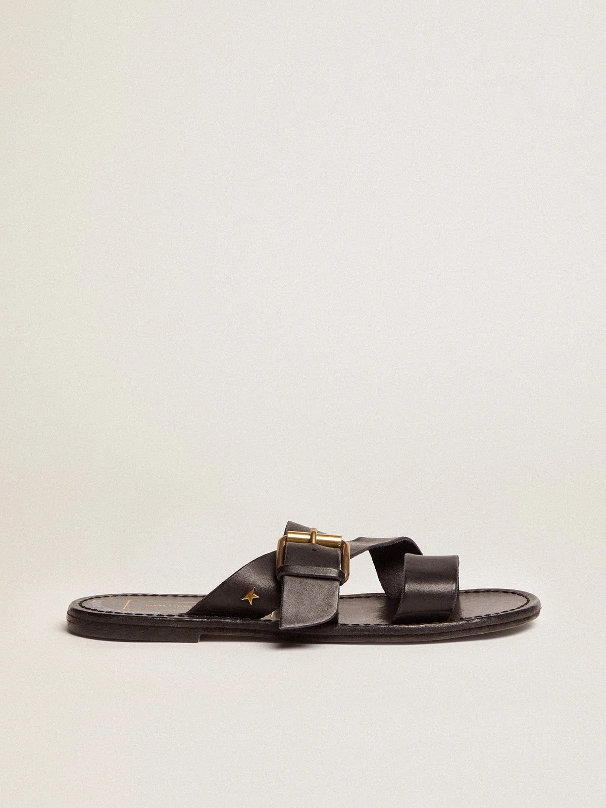 When personality meets practicality: the feminine shape of our Margaret sandals celebrates the versatility of a slip-on design and enhances it with sophisticated details. This version features black crossover resin-coated leather straps and an antique gold color star. The galvanic antique gold buckle completes the look. DETAILS Item No. GWF00323.F003006.90100 - Black resin-coated leather upper - Galvanic antique gold metal buckle - Galvanic antique gold metal star - White contrast lettering on the sole - Vintage finish - Upper: 100% cow leather - Lining: 100% cow leather - Sole: 100% cow leather