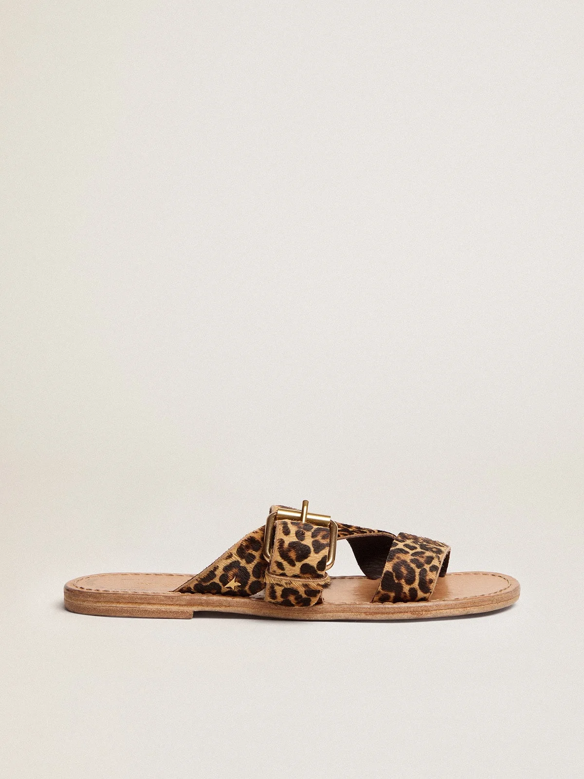 When personality meets practicality: the feminine shape of our Margaret sandals celebrates the versatility of a slip-on design and enhances it with sophisticated details. This version features leopard-print pony skin crossover straps in shades of beige and brown and an antique gold color star. The galvanic antique gold buckle completes the look. DETAILS Item No. GWF00323.F003001.15335 - Beige and brown leopard-print pony skin upper - Galvanic antique gold metal buckle - Galvanic antique gold metal star - Black contrast lettering on the sole - Vintage finish - Upper: 100% cow leather - Lining: 100% cow leather - Sole: 100% cow leather