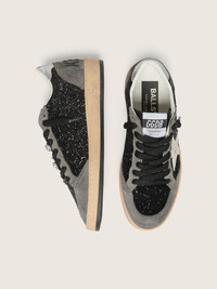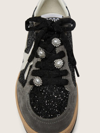 Dreaming of the Eighties. Our Ball Star sneakers have an American college vibe caught between a hoop shot and a skateboard ride. With a black glitter upper with gray suede inserts, this women’s Limited Edition features a white leather star, silver metallic leather heel tab, and black nappa leather tongue. And as a final touch, a pair of special Skins with four silver and pearl-gray charms replaces the plain black laces: beautiful things that never go out of fashion. DETAILS Item No. GWF00117.F008793.90244 - Limited Edition - Black glitter upper with gray suede inserts - White leather star - Silver metallic leather heel tab - Black nappa leather tongue - Added Skins: black laces with four decorative charms - Vintage finish - Upper: 38% polyethylene terephthalate, 29% cow leather, 20% cotton, 8% sheepskin leather, 5% goatskin leather - Lining: 34% cotton, 31% cow leather, 24% textile polyurethane, 7% viscose, 4% polyester - Sole: 100% rubber - Handmade - Made in Italy
