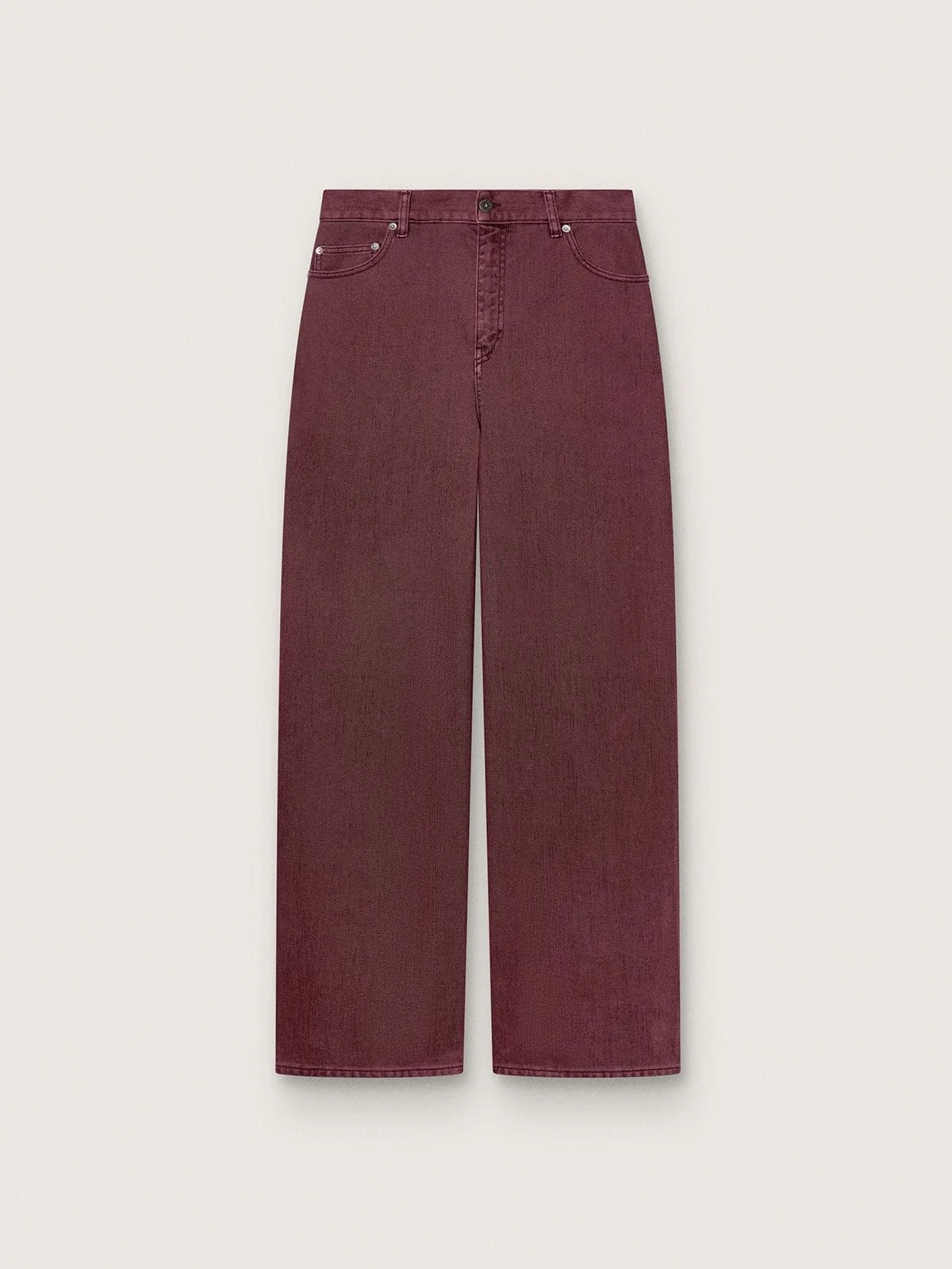 Our Holiday Collection is a celebration of woven textures and sharp tailoring, blending with soft knits, velvet whispers, archive florals, and satin that catches the light just right. Made of burgundy denim with a flocked effect, these women's jeans feature a boyfriend-style straight-leg silhouette and a five-pocket design. The double star on the back completes the look. DETAILS Item No. GWP02079.P002405.40249 - Journey Collection - Color: burgundy - Women's model - Boyfriend fit - Five-pocket style - Design in cotton twill denim with flocked effect - Double star on the back - Main material: 100% cotton - Exterior: 100% viscose - Pocket lining: 65% polyester, 35% cotton - Made in Italy The model is 177 cm tall and is wearing a size 26.