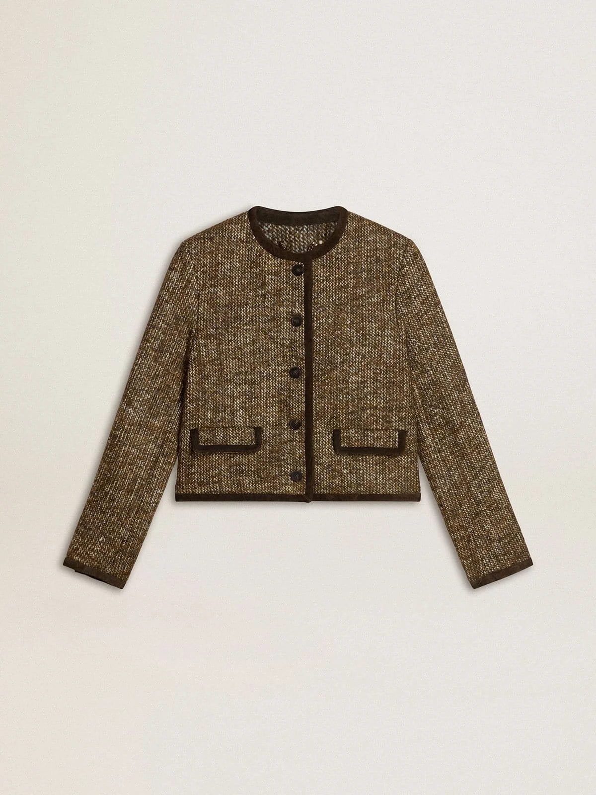 A collection created to be by your side at all times, ready to accompany you on bright days and unforgettable adventures. This women's boxy wool tweed jacket features coffee-colored suede details that define the profile, crew neck and pockets. The fastening with tone-on-tone buttons and the short, structured cut complete the look. DETAILS Item No. GWP01506.P002093.90108 - Journey Collection - Color: coffee - Wool tweed with tone-on-tone suede details - Crew neck - Front closure with tone-on-tone buttons - Front pockets with flap - Short boxy cut - Main material: 100% virgin wool - Inserts: 100% sheepskin leather - Lining: 100% viscose - Handmade - Made in Italy