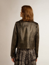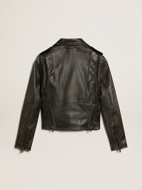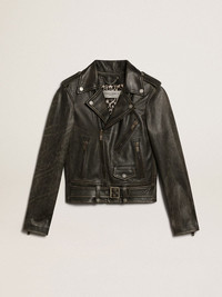A unique, timeless collection that encapsulates the Golden Goose DNA, designed to remain with you every day, through thick and thin, come rain or shine. Made of our traditional bull leather, this slim-fit women’s biker jacket features a distressed treatment. The animal-print lining adds the finishing touch. DETAILS Item No. GWP00848.P000647.90100 - Color: black - Animal-print lining - Double gold star on the back - Slim fit - Four front pockets - Belt with buckle - Long sleeves - Zip fastening - Distressed treatment - Main material: 100% cow leather - Lining: 100% polyester - Sleeve lining: 100% polyester - Made in Italy The model is 177 cm tall and is wearing a size S.