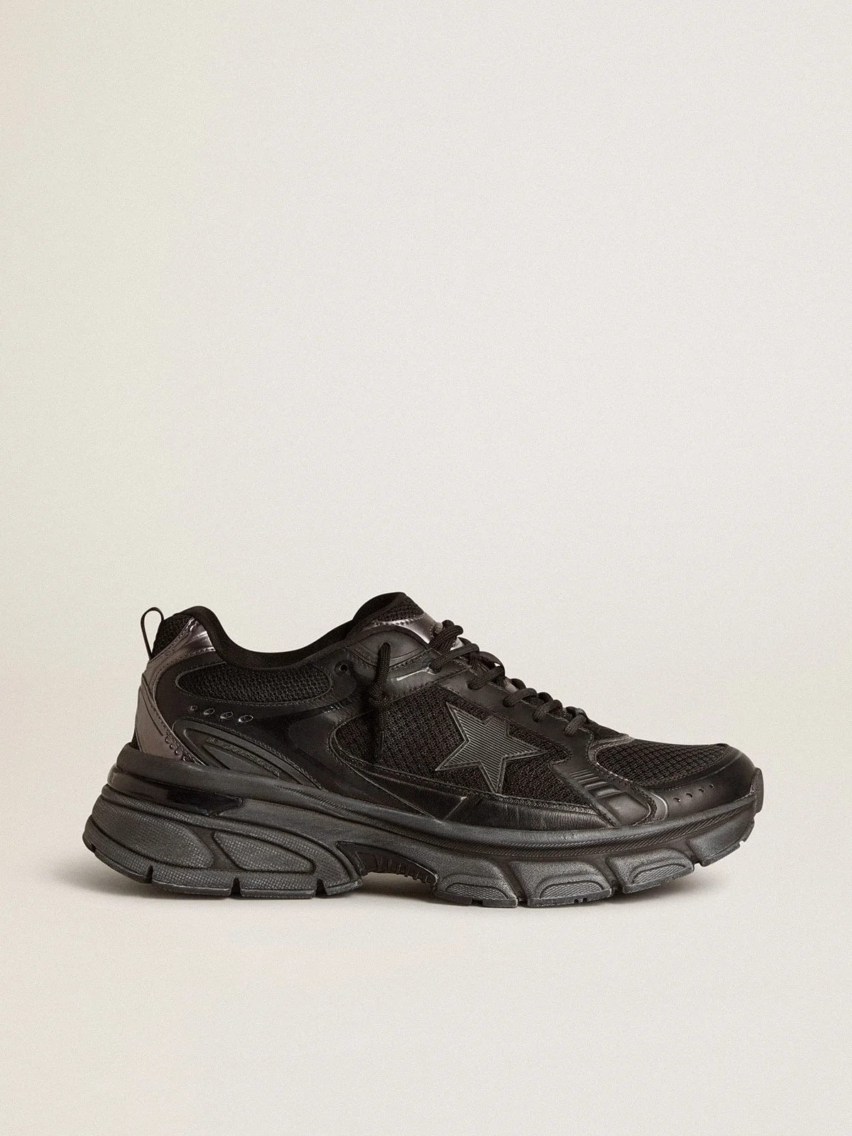 A flashy memory of Y2K. Lightstar is a symbol of nostalgia with a future-forward touch. With metallic flairs, shiny hints of light, and a chunky sole, it’s always in the spotlight. With a black leather and mesh upper, this women’s model features a black TPU star and black laces. This model is embellished with details that complete the look: metallic leather inserts, logo label on the tongue and mesh textures. DETAILS Item No. GWF00724.F006473.90100 - Black leather and mesh upper - Black TPU star - Black TPU heel tab - TPU inserts - Lived-in finish - "Lightstar" insole - Label on the tongue - Logo on the heel - Black tube laces - Upper: 49% polyester, 30% cow leather, 12% polyurethane, 9% sheepskin leather - Lining: 41% cotton, 31% cow leather, 18% polyurethane, 7% polyester, 3% viscose - Sole: 100% rubber - Handmade - Made in Italy