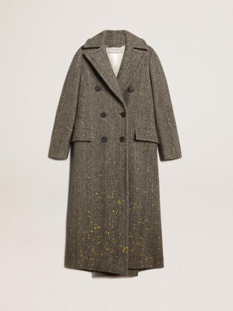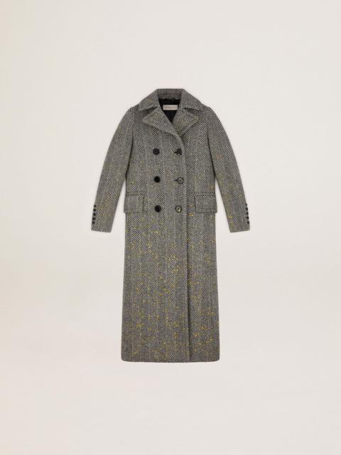 A unique, timeless collection that encapsulates the Golden Goose DNA, designed to remain with you every day, through thick and thin, come rain or shine. This regular-fit double-breasted coat in anthracite-gray chevron wool with herringbone pattern features yellow hand-painted details. The detachable white patch with a finely embroidered letter G in red adds the finishing touch. DETAILS Item No. GWP00496.P000497.81324 - Color: anthracite gray - Yellow hand-painted details - Double-breasted model - Detachable white patch with embroidered red letter G - Tone-on-tone martingale on the back - Regular fit - Two front pockets - Long sleeves - Fastening with black buttons - Main material: 100% virgin wool - Lining: 64% viscose, 36% rayon - Sleeve lining: 52% viscose, 48% acetate - Made in Italy The model is 177 cm tall and is wearing a size S.
