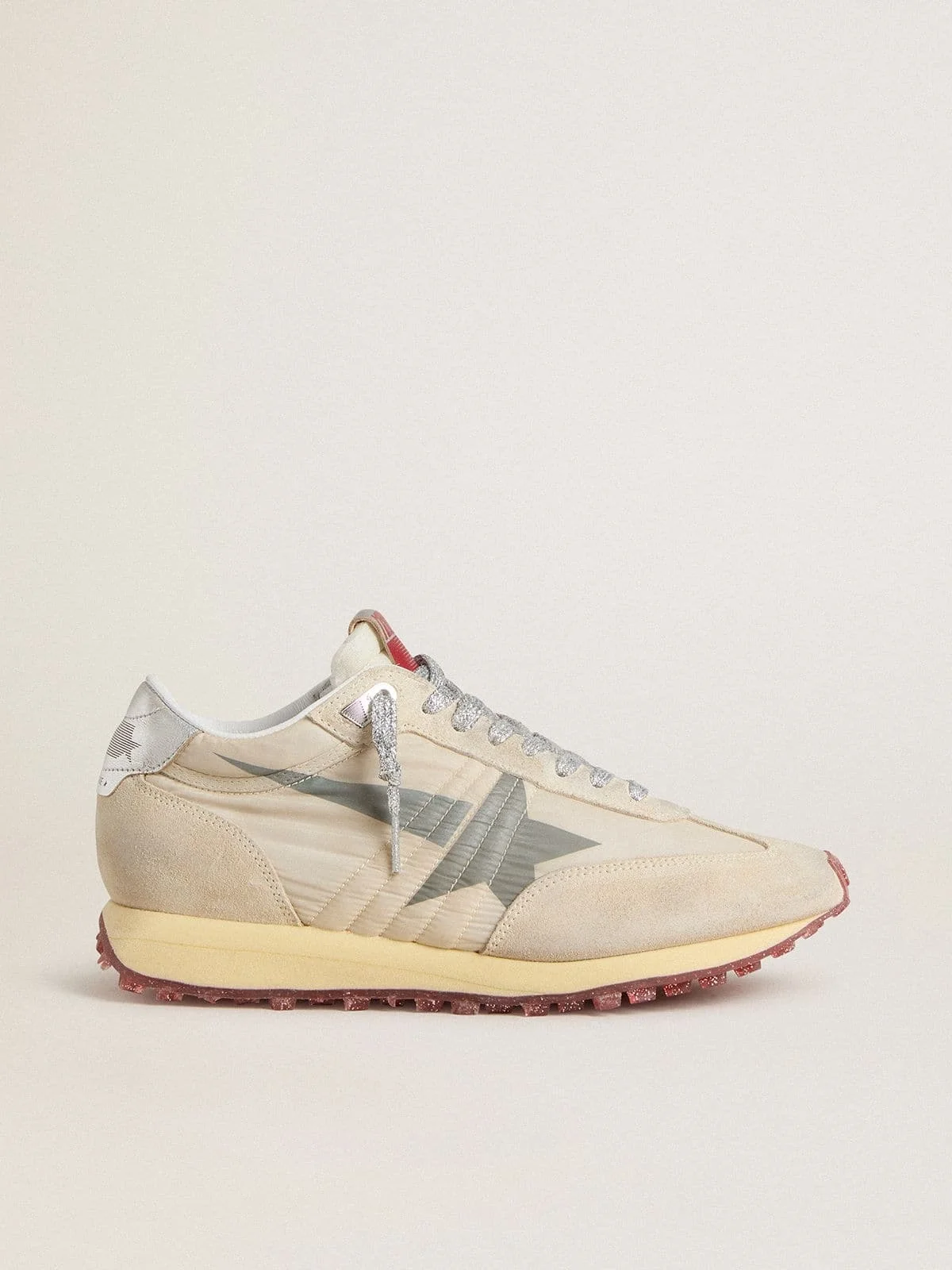 Track and field-inspired, with a Seventies flair. Day after day, our new Marathon sneakers are designed to keep you running after your dreams, paying homage to the marathon that is life. This women's model features a beige nylon upper with beige suede inserts, a gray star, and a silver metallic leather heel tab. The look is completed by silver lurex laces and a starred outsole which make a truly unique impression. DETAILS Item No. GWF00683.F007399.15260 - Beige nylon upper with beige suede inserts - Gray star - Silver metallic leather heel tab - Silver lurex laces - Vintage finish - Upper: 49% polyamide, 38% cow leather, 5% textile polyurethane, 5% polyester, 3% sheepskin leather - Lining: 70% sheepskin leather, 10% textile polyurethane, 20% polyester - Sole: 100% rubber - Handmade - Made in Italy