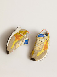 Track and field-inspired, with a Seventies flair. Day after day, our new Marathon sneakers are designed to keep you running after your dreams, paying homage to the marathon that is life. This women’s style features a nylon upper, orange star, and a gray suede toe. The look is completed by unevenly-dyed laces and a starred outsole which make a truly unique impression. DETAILS Item No. GWF00683.F005462.82542 - Yellow nylon upper - Orange star - Orange leather heel tab - Gray suede toe - Jacquard laces with unevenly-dyed effect - Upper: 41% cow leather, 34% polyester, 18% polyamide, 5% polyurethane, 2% sheepskin leather - Lining: 100% sheepskin leather - Sole: 100% rubber - Handmade - Made in Italy