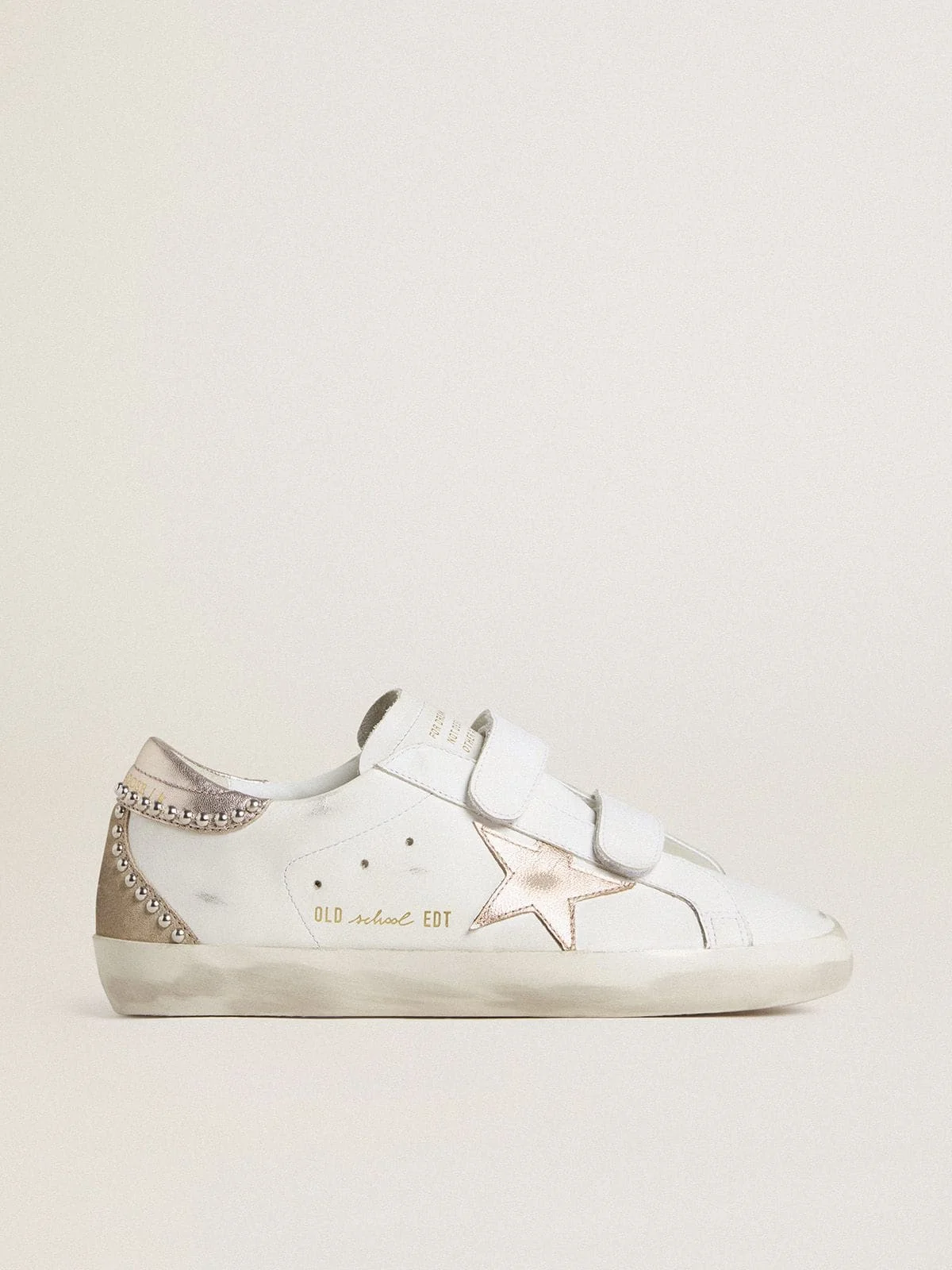 Our Old School sneakers feature two Velcro straps on the front with contrasting logo. This white leather model features a star and heel tab in rose gold laminated leather and a beige suede insert. The silver studs on the back add the finishing touch. DETAILS Item No. GWF00177.F007267.12243 - White leather upper - Rose gold metallic leather star - Rose gold metallic leather heel tab - Beige suede insert - Silver studs on the back - Velcro fastening with contrasting logo - Vintage finish - Upper: 93% cow leather, 7% sheepskin leather - Lining: 41% cotton, 31% cow leather, 18% textile polyurethane, 6% polyester, 4% viscose - Sole: 100% rubber - Handmade - Made in Italy