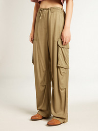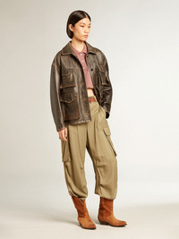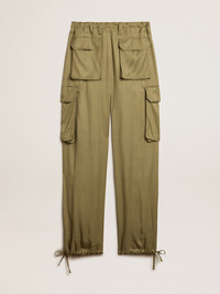 From Venice, our home, to Paris, our dream. This Journey Collection captures the essence and beauty of everyday moments in the City of Lights, immersed in a mesmerizing atmosphere where intimacy, authenticity and curiosity are the pulsating soul of it. These women's cargo pants in olive-colored viscose feature a wide leg and an adjustable drawstring waist. The finishing touch is the stitching details around the knees which give a lived-in effect. DETAILS Item No. GWP01720.P001369.60469 - Journey Collection - Color: olive - Stitching around the knee - Double star on the back - 6 pockets - Adjustable drawstring - Wide leg - Main material: 100% viscose - Made in Italy The model is 177 cm tall and is wearing a size 40.