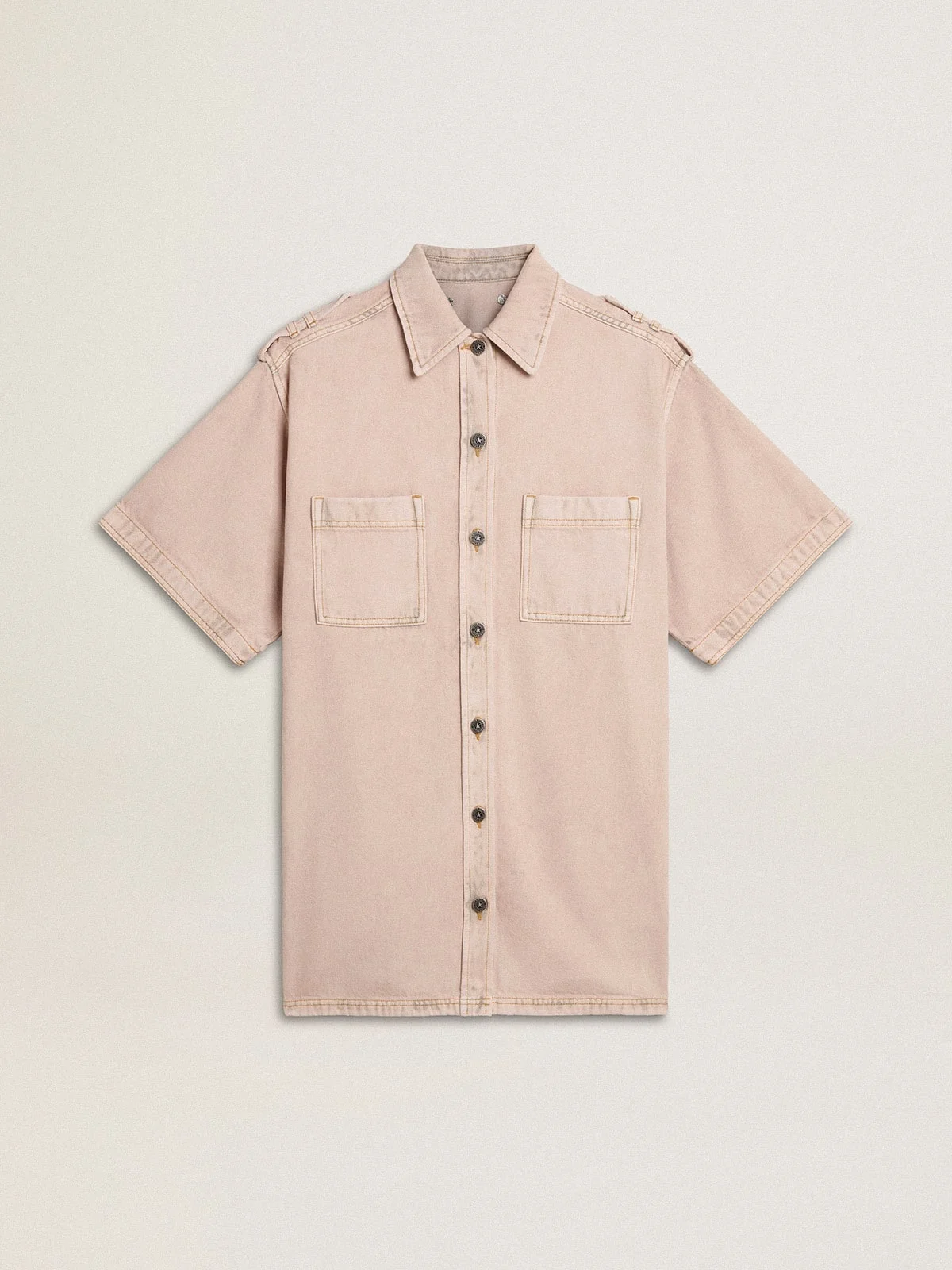 A collection inspired by the harmony of nature, where every detail flows with ease. This cotton denim shirt with an oversized fit is characterized by a special craftsmanship process, unique to each piece: originally black, it is washed and dyed multiple times to achieve this distinctive pastel pink color. Two front pockets, short sleeves and a button closure add the finishing touch. DETAILS Item No. GWP02131.P001854.25235 - Journey Collection - Color: pink - Double star on the back - Oversized fit - Button fastening - Short sleeves - Two front pockets - Main material: 100% cotton - Pocket material: 65% polyester, 35% cotton - Made in Italy The model is 177 cm tall and is wearing a sizeS.