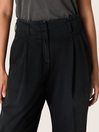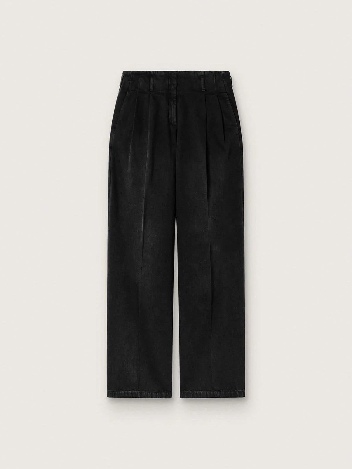 Our Holiday Collection is a celebration of woven textures and sharp tailoring, blending with soft knits, velvet whispers, archive florals, and satin that catches the light just right. Made in black cotton denim with a lived-in treatment, these women's pants feature a wide silhouette with welt pockets on the front and back. The pleat on the front adds a tailored touch, while the double star on the back completes the style. DETAILS Item No. GWP01203.P002347.90100 - Journey Collection - Color: black - Women's model - Regular fit - Wide leg style - Cotton denim with lived-in wash - Manual sanding treatment on the front and back - Belt loops - Two front pockets and two welt pockets on the back - Main material: 100% cotton - Pocket lining: 65% polyester, 35% cotton - Made in Italy The model is 177 cm tall and is wearing a size 26.