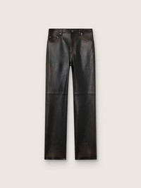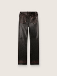 Our Holiday Collection is a celebration of woven textures and sharp tailoring, blending with soft knits, velvet whispers, archive florals, and satin that catches the light just right. Crafted in soft dark burgundy nappa leather, these women's pants feature a slim-fit silhouette and archive-inspired details. The treatments at the points of greatest wear give an authentic lived-in effect, while the viscose inner lining is accentuated by the embroidery with logo and star. The back pockets and the iconic double star on the back complete the look. DETAILS Item No. GWP02555.P002301.40249 - Journey Collection - Color: dark burgundy - Women's model - Straight slim fit - Archive-inspired design with lived-in treatment at wear points - Viscose lining with embroidered logo - Double star on the back - Main material: 100% sheepskin leather - Leg lining: 100% viscose - Pocket lining: 100% cotton - Made in Italy The model is 177 cm tall and is wearing a size S.