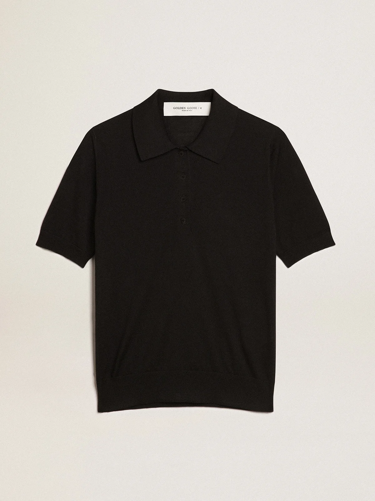 A unique, timeless collection that encapsulates the Golden Goose DNA, designed to remain with you every day, through thick and thin, come rain or shine. This women’s polo shirt in black merino wool features short sleeves and four central buttons. The detachable white patch with a finely embroidered letter G in red adds the finishing touch. DETAILS Item No. GWP01424.P001041.90100 - Golden Collection - Color: black - Four central buttons - Short sleeves - Detachable white patch with embroidered red letter G - Double gold star on the back - Main material: 100% wool - Made in Italy The model is 177 cm tall and is wearing a size S.