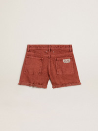 The Resort 2025 Collection invites you to slow down and embrace the effortless beauty of Mediterranean living. A celebration of lived-in textures, laid-back rhythms, and the understated elegance woven into life’s simplest moments. These women's shorts in brick-red washed bull denim with a frayed hem combine a utility spirit with iconic character. The two gold stars on the back and the ""Mediterraneo"" tone-on-tone embroidery on the back pocket add an authentically Golden touch. DETAILS Item No. GWP02305.P002033.30280 - Resort Collection - Color: Autumn Glaze brick red - Regular fit - Fringed hem - Five pockets - Tone-on-tone ""Golden Mediterraneo"" embroidery on the back pocket - Washed bull denim - Two gold stars on the back - Lived-in effect - Main material: 100% cotton - Made in Italy The model is 177 cm tall and is wearing a size S.