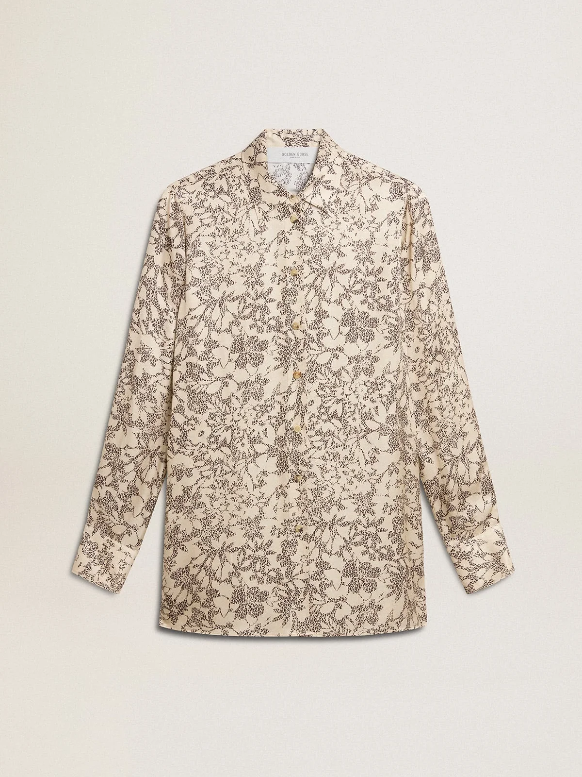 A collection inspired by the harmony of nature, where every detail flows with ease. This pajama shirt in silk blend features a black floral print and a logoed horn button fastening. DETAILS Item No. GWP02263.P001913.15676 - Journey Collection - Color: beige and black - Regular fit - Black floral print - Double star on the back - Logoed horn buttons - Main material: 75% viscose, 25% silk - Made in Italy The model is 177 cm tall and is wearing a size S.