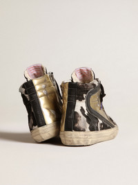 Women’s Slide LAB in zebra-print pony skin with gold inserts
