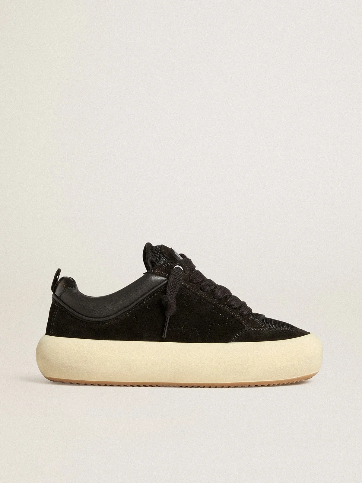 Your new moment to detach from reality and find your center. Your new way to get back to yourself and breathe in your own lightness - flying as never before. Cozy Space-Star Cube shoes feature the extra-cushion sole and insole padded with memory foam, guaranteeing unparalleled comfort starting from the very first step. This women's model, lined in soft leather and with a padded tongue, features a black suede upper accentuated with a tone-on-tone perforated star and a black metallic leather heel tab. Black mesh details and black chunky cotton laces complete the look. DETAILS Item No. GWF00807.F007093.90100 - Black suede upper - Perforated tone-on-tone star - Black metallic leather heel tab - Black chunky cotton laces - Leather lining - Padded tongue with TPU Space logo - Black mesh details - Lived-in finish - Upper: 58% cow leather, 22% sheepskin leather, 20% polyester - Lining: 74% cow leather, 11% polyester, 10% cotton, 5% polyurethane - Sole: 100% rubber - Handmade - Made in Italy