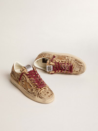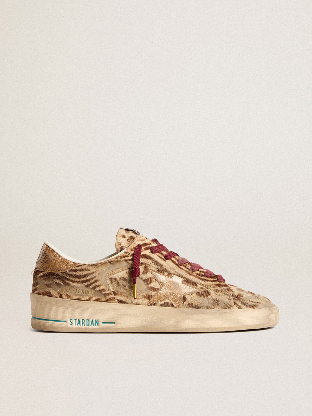 The glorious Nineties wrapped up in a sneaker. The Stardan sneakers pay homage to the basketball icons of that decade, while keeping an eye on the present. In this women's version, the pony skin upper with leopard and zebra print in beige and brown hues features a plastic-effect gold-colored glitter star and heel tab. The gold-colored plasticized glitter insert on the back and wine-colored laces add the finishing touch. DETAILS Item No. GWF00128.F006043.82690 - Beige and brown leopard and zebra print pony skin upper - Plastic-effect gold glitter star - Plastic-effect gold glitter heel tab - Plastic-effect gold glitter inserts - Wine-red laces - Vintage finish - Upper: 67% cow leather, 15% thermoplastic polyurethane, 10% polyester, 8% polyethylene terephthalate - Lining: 43% cotton, 26% cow leather, 20% textile polyurethane, 6% polyester, 5% viscose - Sole: 100% rubber - Handmade - Made in Italy
