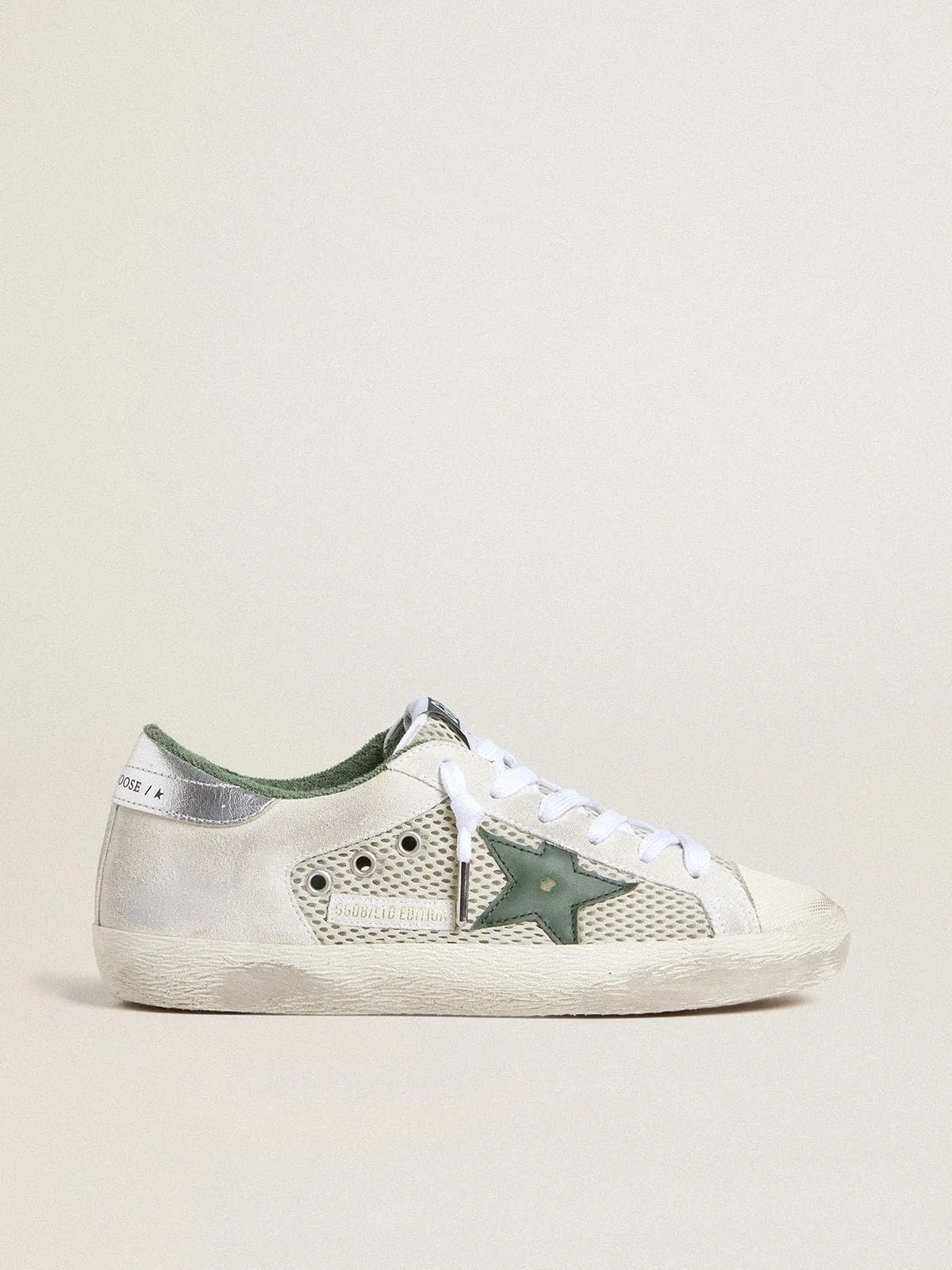 Women’s Super-Star in white suede and mesh with green leather star and silver foiled leather heel ta
