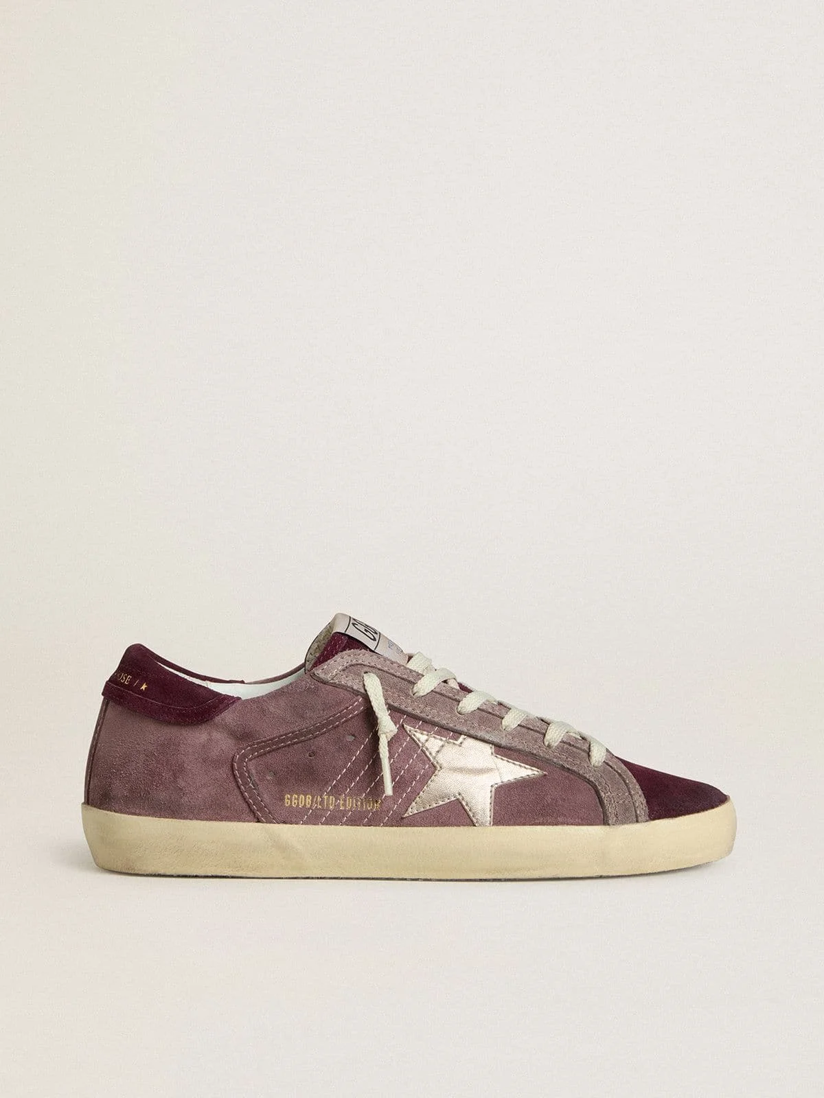 A timeless icon yet one that’s constantly evolving. At Golden, we love taking our classics and reworking them all the time, always from a new angle. These women's Super-Star with a lilac suede upper feature a silver metallic leather star, a burgundy suede heel tab and a burgundy suede tongue. And white laces add the finishing touch. DETAILS Item No. GWF00101.F007966.45457 - Lilac suede upper - Silver metallic leather star - Burgundy suede heel tab - Burgundy suede tongue - White laces - Vintage finish - Upper: 97% cow leather, 3% sheepskin leather - Lining: 41% cotton, 31% cow leather, 18% textile polyurethane, 6% polyester, 4% viscose - Sole: 100% rubber - Handmade - Made in Italy