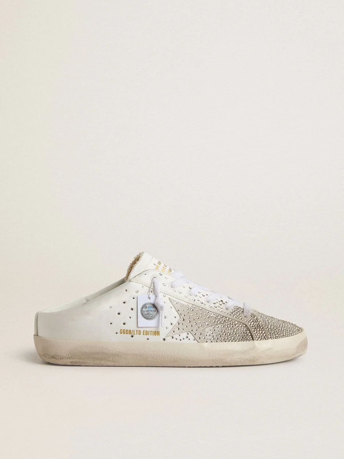 A timeless icon yet one that’s constantly evolving. At Golden, we love taking our classics and reworking them all the time, always from a new angle. These women's Super-Star Sabot with a white leather upper feature a gray suede star and ombre-effect Swarovski crystal decoration. And white laces add the finishing touch. DETAILS Item No. GWF00110.F007256.10100 - White leather upper - Gray suede star - White laces - Ombre-effect Swarovski crystal decoration - Vintage finish - Upper: 67% polyethylene terephthalate, 29% cotton, 4% cow leather - Lining: 37% textile polyurethane, 30% cow leather, 21% cotton, 12% viscose, 10% sheepskin leather - Sole: 100% rubber - Handmade - Made in Italy