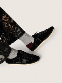 The sabot version of our iconic sneakers: these women's Super-Star feature the classic upper in black velvet and a black leather star with micro-glitter. The black cotton trim and black lurex laces complete the look. DETAILS Item No. GWF00110.F007861.90100 - Black velvet upper - Black leather star with micro-glitter - Black lurex laces - Black cotton trim - Vintage finish - Upper: 31% cotton, 31% viscose, 17% polyester, 17% cuprammonium rayon, 4% cow leather - Lining: 33% textile polyurethane, 31% cow leather, 25% cotton, 11% viscose - Sole: 100% rubber - Handmade - Made in Italy