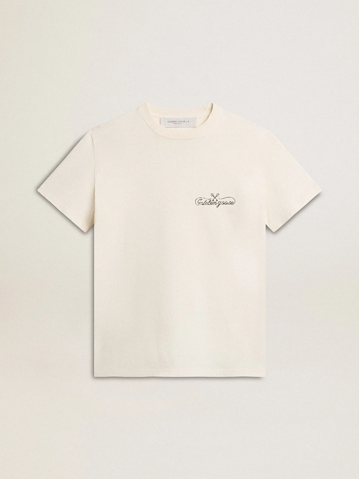 A love story to our home, Marghera. Where everything began. Our latest collection reflects the spirit of our birthplace, its contrasts, industrial soul, and manufacturing landscapes, weaving together inspirations from both the vibrant energy of workwear and the refined essence of traditional tailoring. In aged-white cotton jersey, this women’s T-shirt features a black logo printed on the chest. DETAILS Item No. GWP01220.P001625.11569 - Journey Collection - Color: aged white - Double star on the back - Regular fit - Logo printed on the chest - Main material: 100% cotton - Made in Italy The model is 177 cm tall and is wearing a size S.