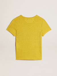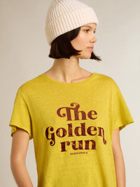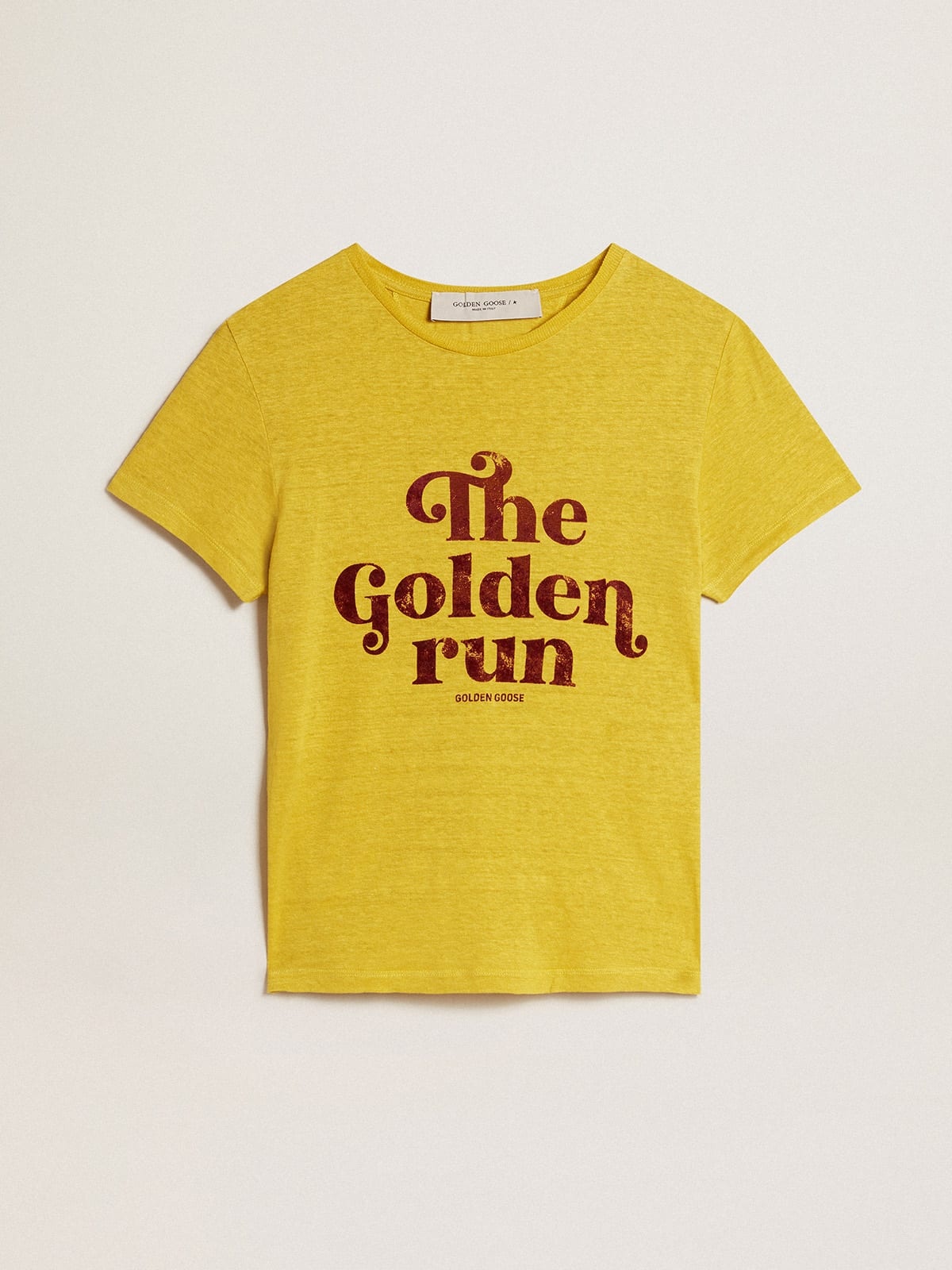 An ode to Venice, our home, seen with the eyes of those dreamers who live it every day. This Journey Collection explores the city of our roots, drawing inspiration from the people who inhabit it. Different, iconic places now discovered through the life of its lovers. This women’s college-inspired regular-fit round-neck T-shirt in maize-yellow linen features vintage-effect burgundy lettering printed at the center. DETAILS Item No. GWP01221.P001215.20340 - Journey Collection - Color: maize yellow - Double star on the back - Burgundy “Golden Goose Running Club” printed lettering at the center - College-inspired - Regular fit - Main material: 100% linen - Rib material: 100% cotton - Made in Italy The model is 177 cm tall and is wearing a size S.