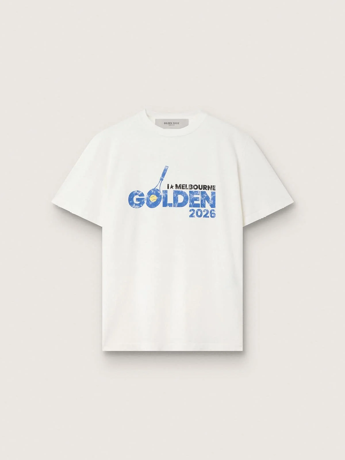 Inspired by the iconic Seventies, the carefree spirit of that era comes to life. This short-sleeved T-shirt in white cotton, inspired by Australian legendary games, features an ‘I love Melbourne’ print on the front in blue, yellow and black. DETAILS Item No. GWP01220.P002747.10365 - Color: white - Short sleeves - ‘I love Melbourne’ print on the front in blue, yellow and black - Two stars on the back - Vintage finish - Main material: 100% cotton - Made in Italy