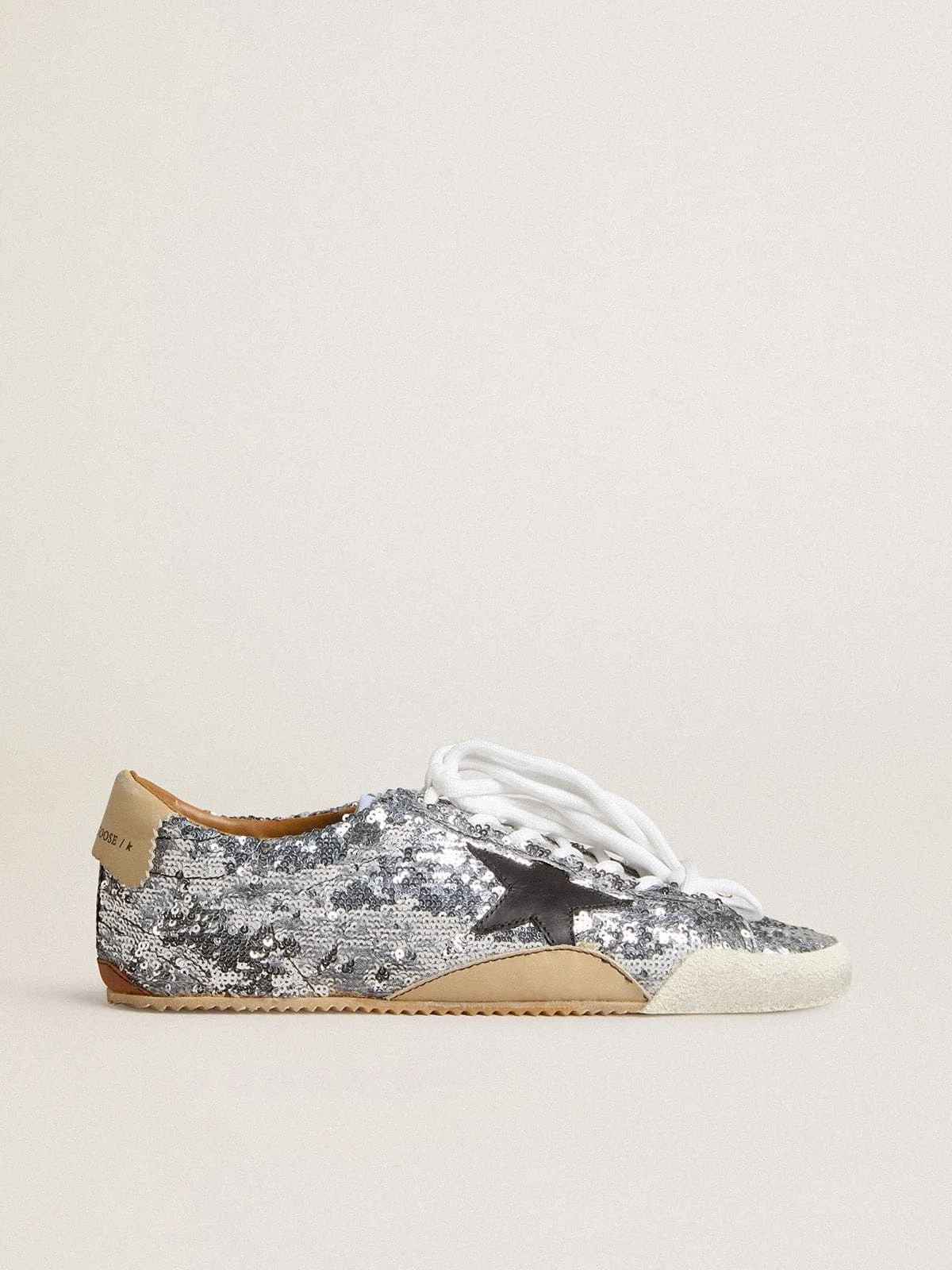 Rooted in '60s running heritage, the True-Star brings retro style and timeless performance back to the track. This women's model with a silver-colored sequin upper features a white toe cap, a black leather star, and a glossy red leather insert on the back. The beige leather heel tab and white laces on the right shoe and black laces on the left shoe add the finishing touch. An extra double lace with which you can try new style combinations is included with this True-Star. DETAILS Item No. GWF00922.F007384.70330 - Silver-colored sequin upper - Black leather star - Red leather insert on the back - Beige leather heel tab - Beige and tobacco leather inserts - 160cm white lace and black lace - Extra Double Lace, both white and black, 160 cm, inside the package - Contrast stitching - Internal and external patch for protection and support - Regular toe cap pressed to make the toe slightly square - Lived-in finish - Upper: 46% polyester, 25% cotton, 24% cow leather, 5% nylon - Lining: 41% cotton, 31% cow leather, 28% sheepskin leather - Sole: 100% rubber - Handmade - Made in Italy
