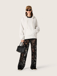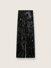 Our Holiday Collection is a celebration of woven textures and sharp tailoring, blending with soft knits, velvet whispers, archive florals, and satin that catches the light just right. Made of black tulle decorated with all-over floral embroidery in black sequins, these women's wide-fit pants feature a see-through effect and an invisible nylon zip fastening. The tone-on-tone crepe shorts lining completes the look. DETAILS Item No. GWP02475.P002320.90100 - Journey Collection - Color: black - Women's pants - Wide fit - Jogging style - Tulle fabric with floral embroidery in black sequins - Shorts-style inner lining in tone-on-tone polyester crepe - Invisible nylon zip fastening - See-through effect - Main material: 100% polyester - Made in Italy The model is 177 cm tall and is wearing a size S.