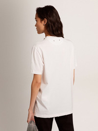 A unique, timeless collection that encompasses the essence of Golden Goose, designed to remain with you every day and accompany your highs and lows, come rain or shine. In white cotton, this regular-fit T-shirt features cabochon crystals on the collar and a detachable white patch with a finely embroidered letter G in red. DETAILS Item No. GWP01220.P000673.10363 - Color: white - Cabochon crystals on the collar - Double gold star on the back - Detachable white patch with embroidered red letter G - Regular fit - Short sleeves - Main material: 100% cotton - Made in Italy The model is 177 cm tall and is wearing a size S.