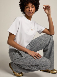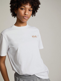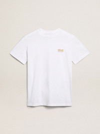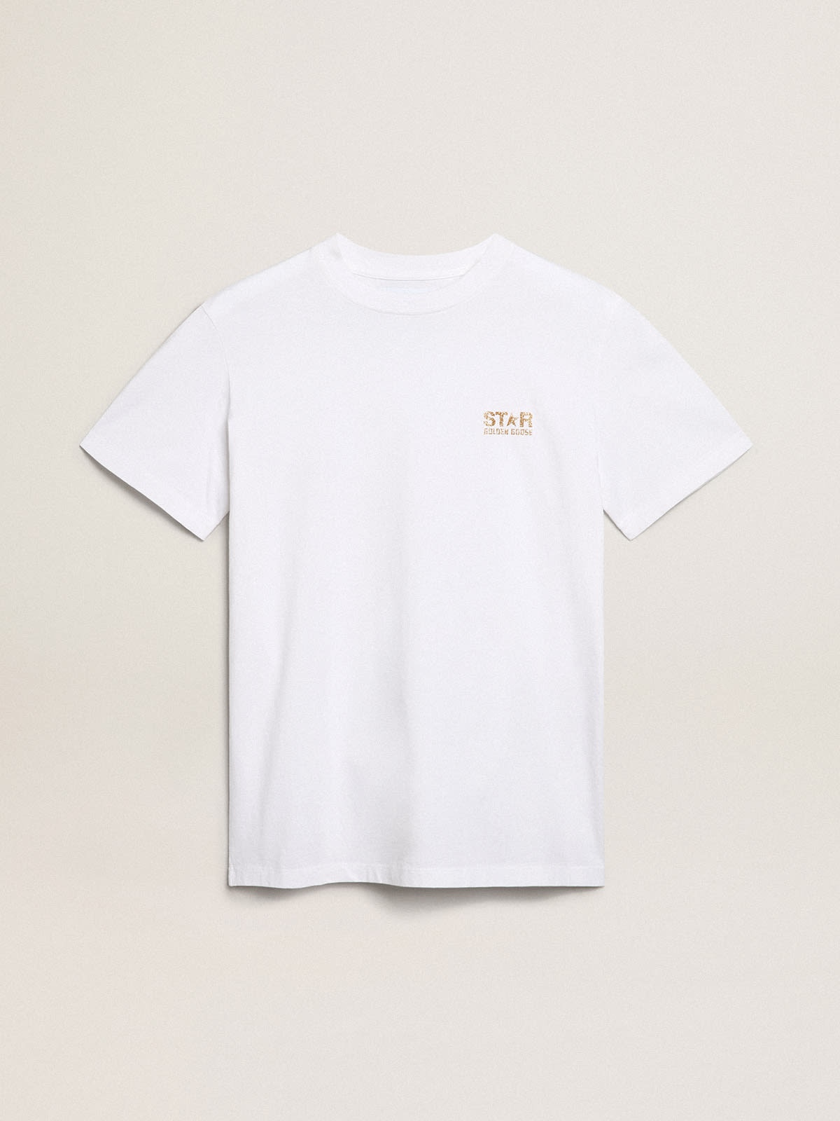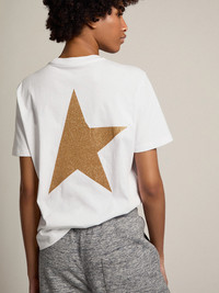 A collection with a casual soul but a versatile attitude: inspired by the Seventies, it has a timeless vintage appeal, suited to any occasion or look. This round-neck, regular-fit T-shirt in pure white cotton features a logo on the front and a maxi star on the back, both in gold glitter. DETAILS Item No. GWP01220.P000880.10272 - Color: white - Gold glitter logo on the front - Maxi star in gold glitter on the back - Round neck - Short sleeves - Regular fit - Main material: 100% cotton - Rib material: 100% cotton - Made in Italy The model is 177 cm tall and is wearing a size S.