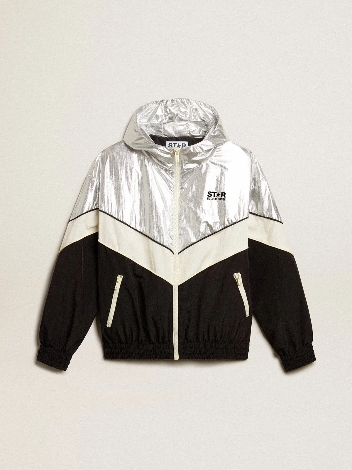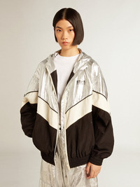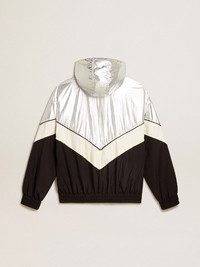 A collection with a casual soul but a versatile attitude: inspired by the Seventies, it has a timeless vintage appeal, suited to any occasion or look. In silver and black-colored technical fabric, this hooded windcheater for women features a zip fastening and a "V"-shaped motif in cream-colored ripstop with black edging. And as a final touch, the Star logo is printed on the chest. DETAILS Item No. GWP01827.P001454.90438 - Star Collection - Color: silver and black - Cream-colored ripstop V motif - Style with hood - Zip fastening - Elasticated cuffs and hems - Two pockets with zip fastening - Star logo on the chest - Main material: 100% nylon - Contrasting material: 72% polyamide, 28% polyester - Lining material: 100% polyester - Pocket lining: 100% nylon - Made in Italy The model is 177 cm tall and is wearing a size S.