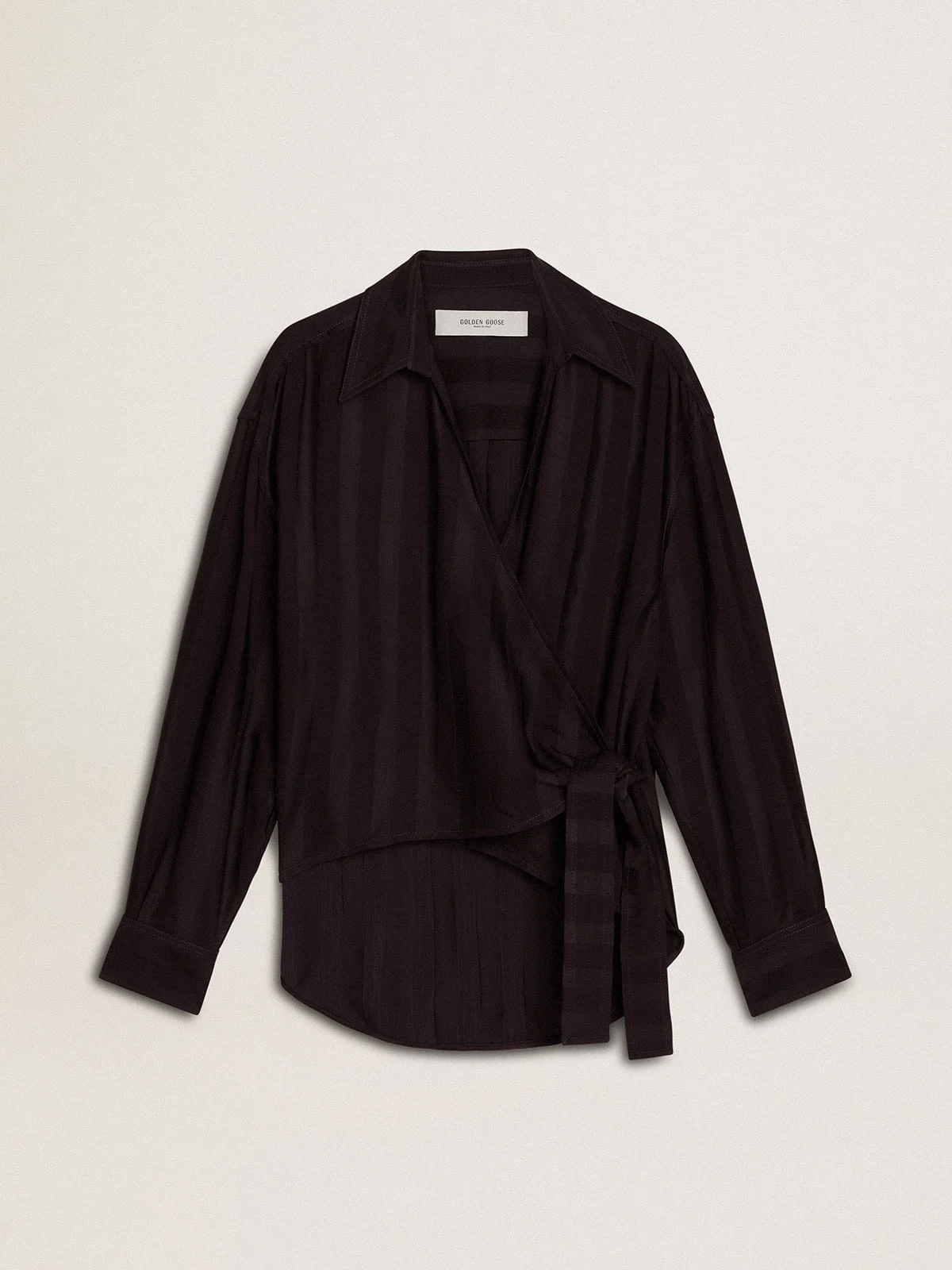Inspired by the electric energy of the Nineties, the collection celebrates the limitless power of shared dreams. Moved by passion, each design captures the meaning of togetherness and the power of music. This black shirt with vertical tone-on-tone stripes features a side knot closure and an oversized fit. The double star on the back adds the finishing touch. DETAILS Item No. GWP02146.P001907.45435 - Journey Collection - Color: black - Oversized fit - Double star on the back - Side closure with knot - Tone-on-tone vertical stripe motif - Main material: 96% viscose, 4% cotton - Made in Italy The model is 177 cm tall and is wearing a size S.