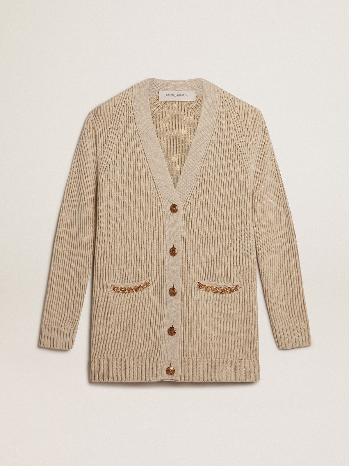 An ode to Venice, our home, seen with the eyes of those dreamers who live it every day. This Journey Collection explores the city of our roots, drawing inspiration from the people who inhabit it. Different, iconic places now discovered through the life of its lovers. This loose-fit open cardigan in wool, cotton and lurex blend jacquard features a fisherman’s rib knit. The glossy effect is emphasized by the addition of gold metal chains at the front pocket openings as well as gold heraldic buttons. DETAILS Item No. GWP01516.P001188.15514 - Journey Collection - Color: wool white - Fisherman’s rib knit - Metal chains on the pockets - Double star on the back - Gold heraldic button fastening - Two pockets - Boxy fit - Main material: 50% wool, 35% cotton, 15% lurex - Collar material: 100% wool - Pocket material: 100% wool - Made in Italy The model is 177 cm tall and is wearing a size S.