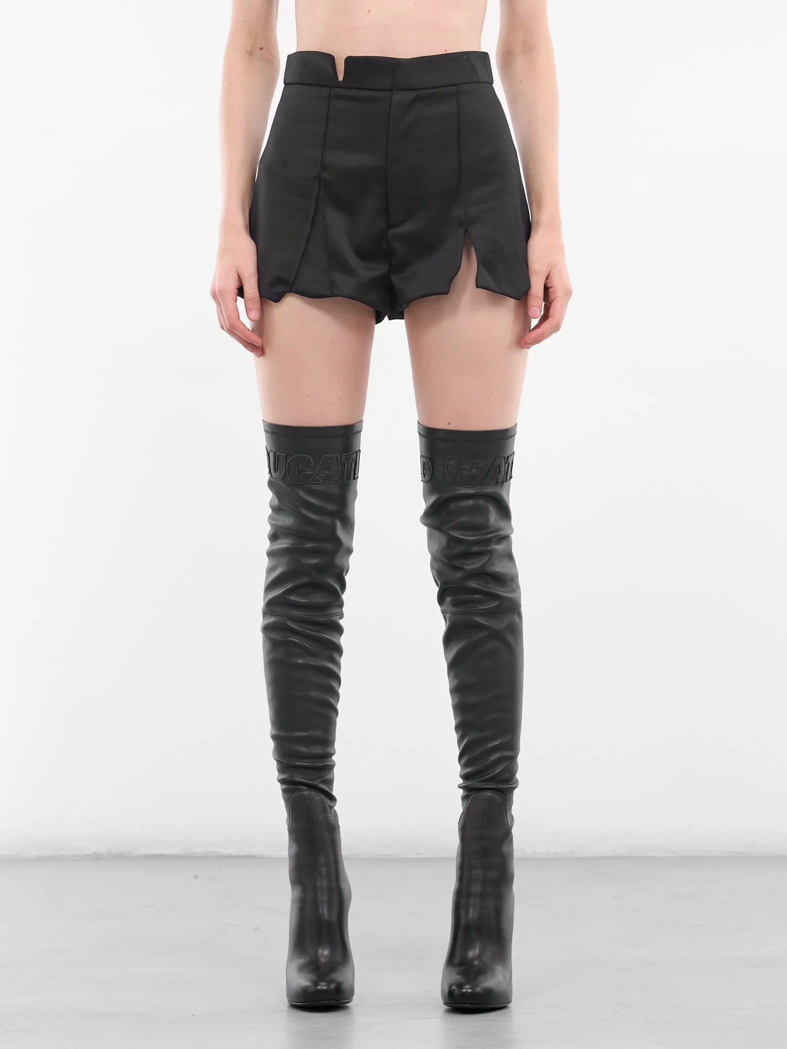 Black wool-rayon shorts with asymmetric hems and silver-tone hardware at the back. Featuring: • Slim fit • Wool and rayon construction • High waist • Asymmetric hems and vents • Concealed zip fly closure • Back signature silver-tone hardware • Back flap pocket • Mini length • Made in US • Material 1: 100% Wool | Material 2: 100% Rayon • French sizing Model is 5'9" wearing size 34. Bust: 32" Waist: 25" Hips: 34"