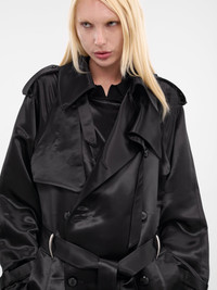 A black liquid viscose trench coat with silver-tone claw accents. The double-breasted design, belted waist, and epaulets emphasize its fluid military structure. Featuring: • Relaxed fit • Liquid viscose construction • Spread collar with storm flap and shoulder epaulets • Long sleeves with cuff straps and belt loops • Double-breasted button closure • Belt with silver-tone claw hardware • Side welt pockets and back vent • Maxi length • Made in USA • 100% Viscose • French sizing Model is 5'9" wearing size 38. Bust: 32" Waist: 25" Hips: 34"