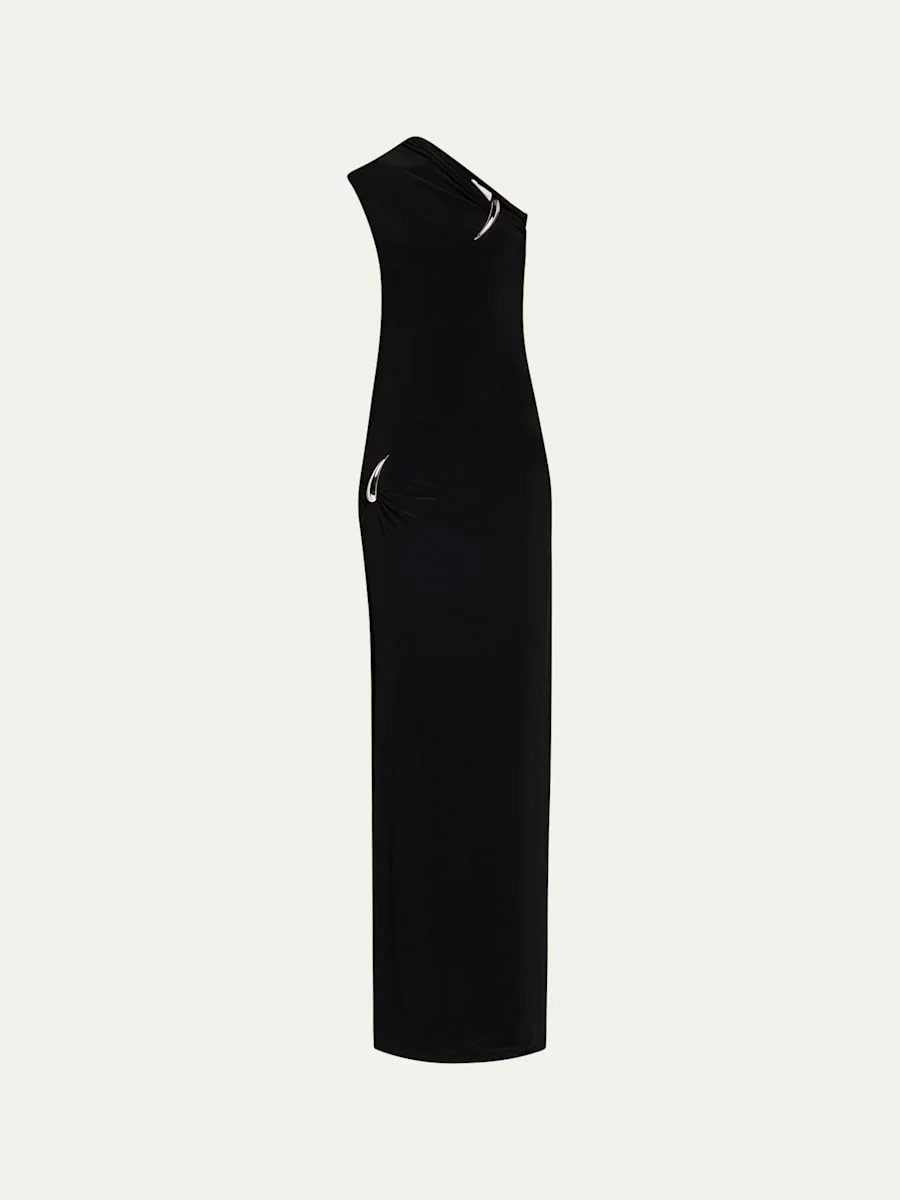 GRACE LING down featuring gathering with silvertone claw details and a thigh slit One-shoulder neckline Sleeveless Column silhouette Full length Thigh-high side slit hem Side zip Polyester/spandex Dry clean Made in USA from imported materials Online Inquiries: BGS21_B9SWE| Store Inquiries: #4959680