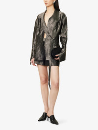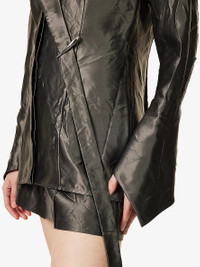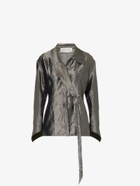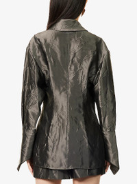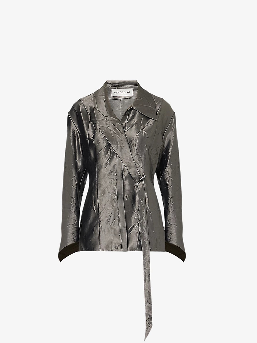 PRODUCT DETAILS - Grace Ling woven shirt - 100% viscose - Concealed button fastenings at front - Oversized fit, asymmetric collar, belt detail, biomorphic claw belt loop, branded silver-toned hardware at back, long sleeves, pointed cuffs, crinkled shiny fabric - Dry clean - Made in New York - True to size - Size UK 8: length 30in / 76cm - Model is 5ft 10in/1.78m and wears a size UK 8 - Midweight, non-stretch Ref: R04418731