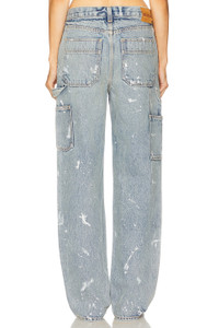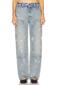 - Denim textile - Made in USA of imported materials - Machine wash recommended - Zip fly with button closure - Double knee design and carpenter pockets - Intentional distressing and fading with light whiskering - Heavyweight coated rigid denim fabric.18" at the leg opening - Revolve Style No. GRLR-WJ738 - Manufacturer Style No. GFJ10024 F25