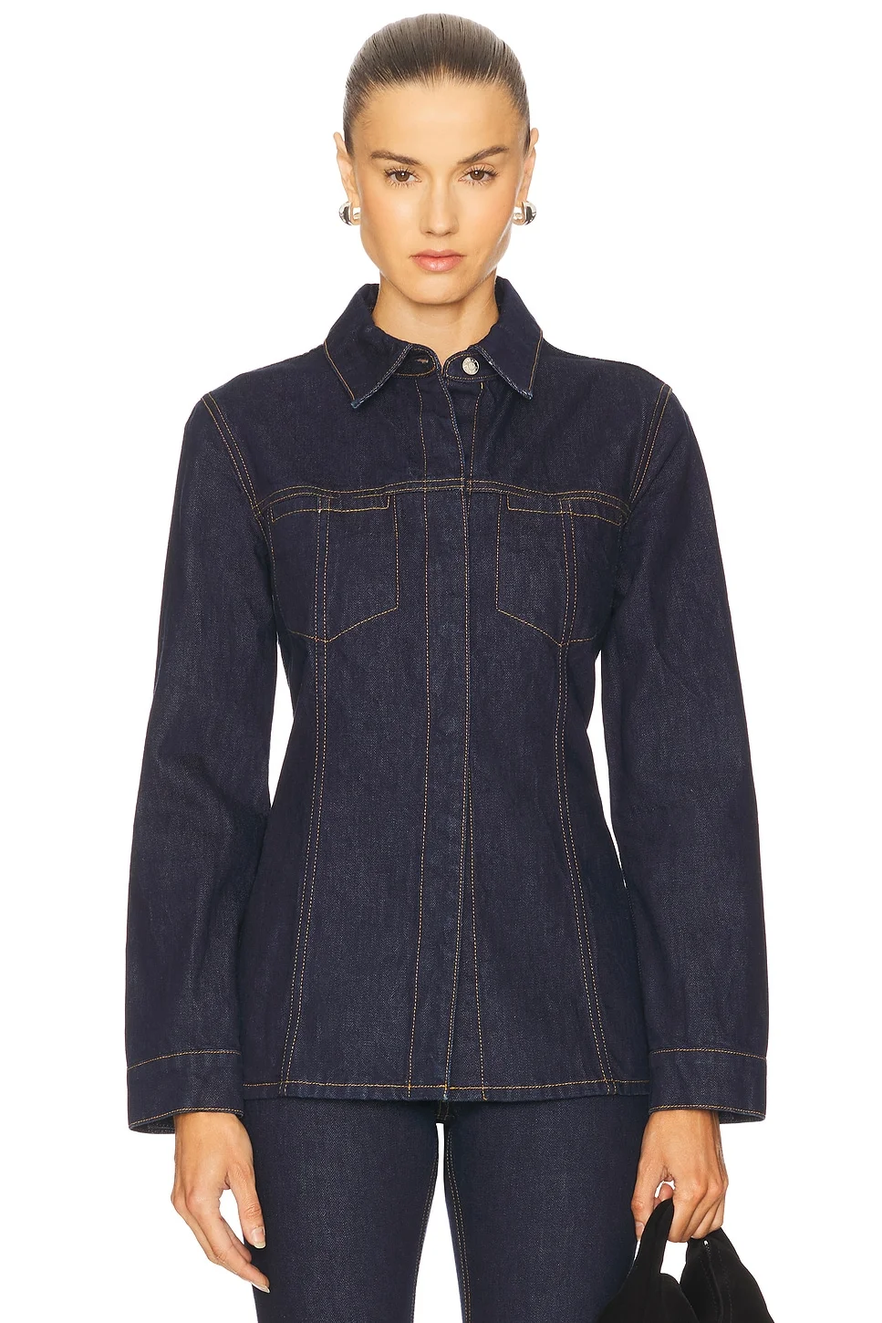 - 100% cotton - Made in USA of imported materials - Machine wash cold - Front hidden button closure - Breast slip pockets - Contrast stitching Midweight rigid denim fabric - Item not sold as a set - Revolve Style No. GRLR-WO130 - Manufacturer Style No. GFOW10003 F25