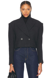 Details - Self: 50% wool, 30% polyester, 10% acrylic, 5% polyamide, 5% other fibers - Lining: 55% polyester, 45% viscose - Made in China - Dry clean only - Double breasted closure - Single exterior and interior breast pocket - Melton fabric with padded shoulders - Our Style No. GRLR-WO120 - Manufacturer Style No. GROW97 H24