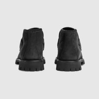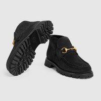 Designed with the classic shape of the loafer, the Horsebit ankle boot bridges the past to the present. Defined by a slim silhouette, the boot pays homage to the House's history, and is presented in brown suede. - Black suede - Women's - Light gold-toned hardware - Horsebit - Rubber sole - Flat - Heel height: 0.5" - Made in Italy