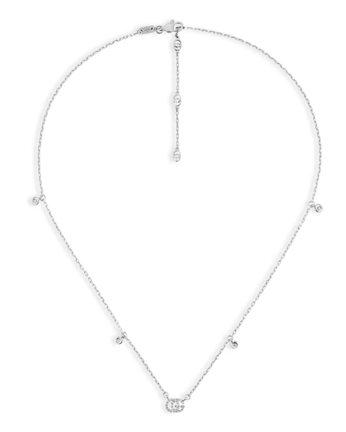SIZE & FIT - Founded in Florence in 1921, Gucci is one of the world's leading luxury fashion brands, with a renowned reputation for creativity, innovation, and Italian craftsmanship. - Reflecting and defining the styles and attitudes of each era, Gucci has influenced fashion and culture for more than a century. PRODUCT DETAILS - Diamonds: 0.09 ct. t.w.; color/clarity: GH/VVS - 18K white gold - 14.5"-16.5" adjustable length; pendant: 0.25"L - Lobster clasp closure - Photo may have been enlarged and/or enhanced - All gemstone carat weights (ct. t.w.) are approximate; variance may be 0.05 carat. - White gold is surface-coated with rhodium to enhance metal color and shine; it may wear off over time requiring replating. - Made in Italy Web ID: 2887172