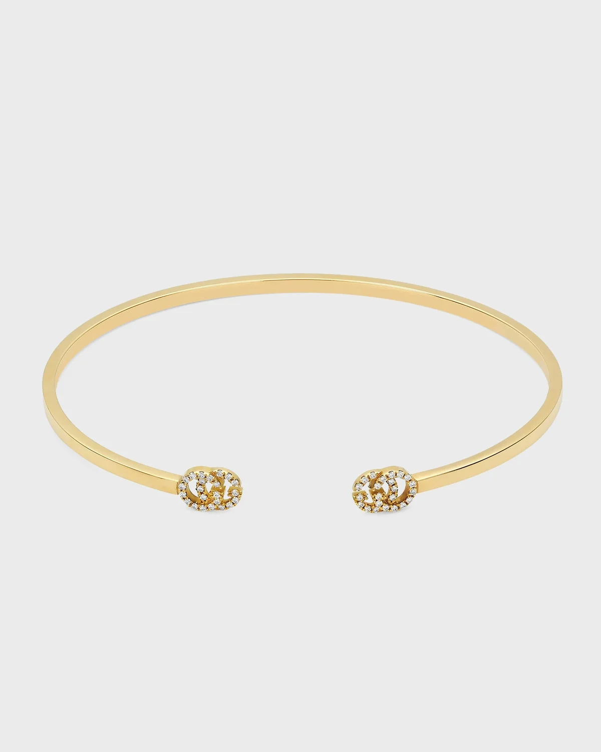 GG Running cuff bangle with diamonds. Polished 18karat yellow gold hardware. Thin frame with interlocking GG ends. 46 diamonds; 0.10 total carat weight. Split opening eases dress. Approx. 0.3"W x 0.2"H. Made in Italy.