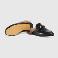 Emblematic looks are presented in the Ouverture collection and create a link to Gucci’s rich history. The Princetown slipper is fully lined and trimmed with wool then finished with the House's signature Horsebit detail. - Featured in Vogue’s 25 Ways to Gucci - Black metal-free tanned leather - This item uses women's sizing - Horsebit detail - Elongated toe - Leather sole - Flat - These shoes run small, we recommend sizing up half a size - Made in Italy